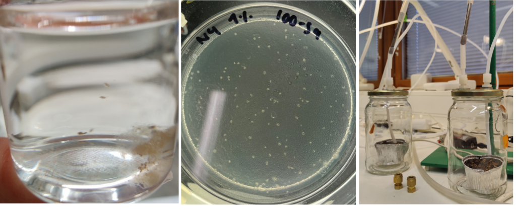 Kolme erilaista testausta menossa. Vasemmanpuoleisessa kuvassa on vesikirpputesti biopohjaiselle materiaalille. Keskimmäisessä kuvassa on Ames-testi, jossa on havaittavissa bakteeripesäkkeitä. Oikeanpuoleisessa kuvassa kerätään Tenax TA -putkiin kasvatusalustasta emittoituvia yhdisteitä.