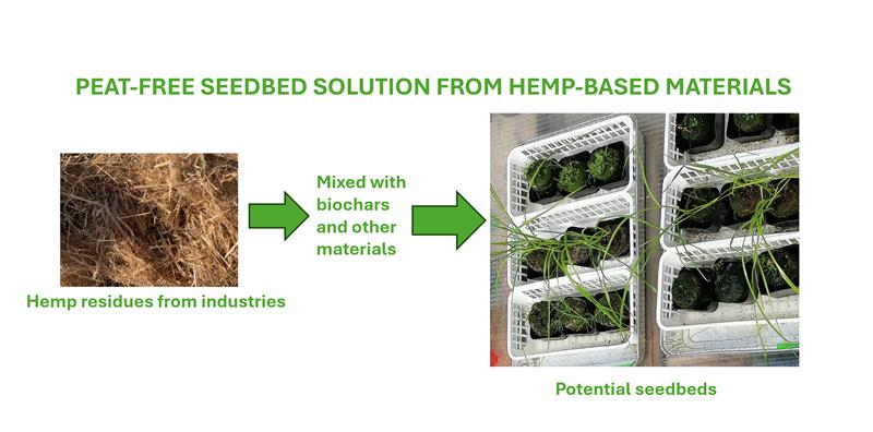 UEF:lla olemme selvittäneet hamppupohjaisten kasvualustojen soveltuvuutta turpeen korvaajaksi. Tarkastelun kohteena ovat olleet mm. hamppukuitua, päistärettä, biohiiltä ja pyrolyysitisleitä sisältävät ratkaisut. Yleisesti elintarviketuotannon edulliset sivutuotteet soveltuvat myös kasvualustoihin ja niillä on saatu lupaavia tuloksia kasvualustakokeissa. Hamppukuidulla on korvattu esimerkiksi kivivillaa, ja biohiilen lisääminen kasvualustaan voi parantaa muun muassa vedenpidätyskykyä ja rakenteellista vakautta. Biohiilen ja tisleen ominaisuudet riippuvat kuitenkin voimakkaasti lähtöaineesta ja pyrolyysiprosessin parametreista, minkä vuoksi räätälöidyt ratkaisut tuottavat parhaita tuloksia. Aiheeseen liittyen on jätetty patenttihakemus syyskuussa 2025.